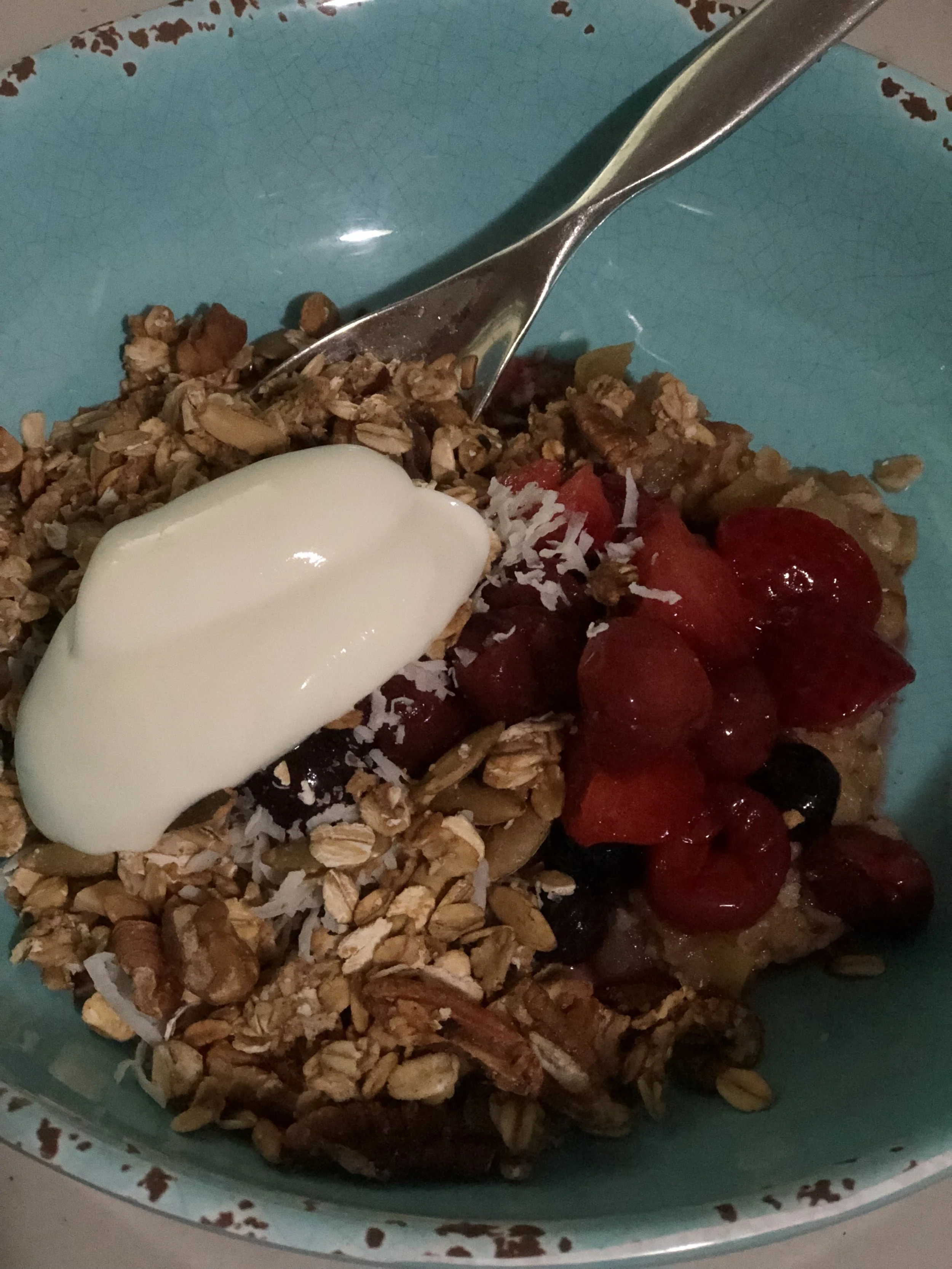 ◦ Top with “Santa Monica granola” or toppings of choice (I like thawed frozen berries, pumpkin seeds, shredded coconut, and Greek yogurt)